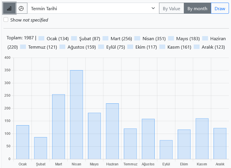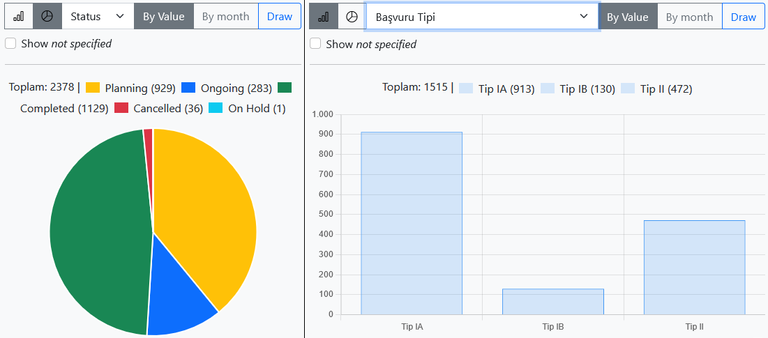 Projelerinizi, tablo üzerinde süzdükten sonra ya da süzmeden, anlık olarak bar veya pasta grafiğe dökebilirsiniz. Durum, öncelik vb. varsayılan parametrelere göre, ya da proje tipine tanımladığınız özel parametrelere göre saniyeler içinde grafikler elde edebilirsiniz.