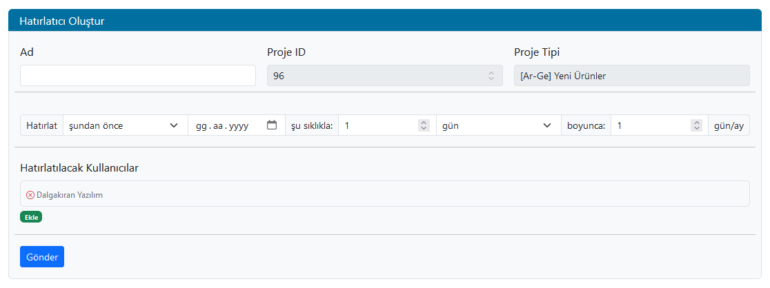 Projelerinize statik (tarih seçerek) veya dinamik (bir tarih parametresinin güncel değerine bağlayarak) hatırlatıcılar oluşturun. Hangi sıklıkla ve ne kadar zaman boyunca çalışacağını da ayarlayabildiğiniz hatırlatıcılar sayesinde önemli gün ve olayları kaçırmayın.