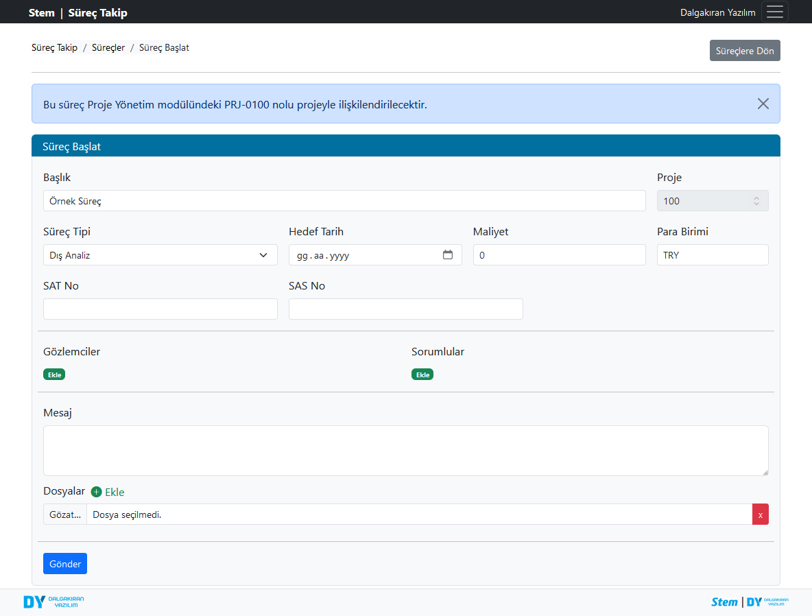 Süreçleri proje yönetim modülündeki projeler ile ilişkilendirebilirsiniz. Böylece bir projenin yaşam döngüsü boyunca hangi süreçlerin yürütüldüğünü ve bunların toplam maliyetini kolayca görüntüleyebilirsiniz.